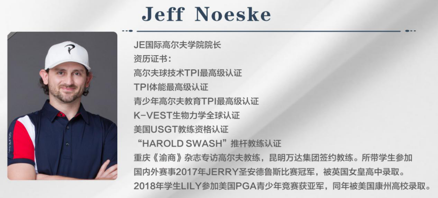 JE國際高爾夫?qū)W院(JE International Golf Academy)主營青少年及成人專業(yè)高爾夫教學(xué),擁有國際化師資團隊,由美國、加拿大、蘇格蘭外籍教練和中國職業(yè)教練團隊組成,同時也提供高爾夫賽事、活動策劃、冬夏令營、高爾夫留學(xué)等優(yōu)質(zhì)服務(wù)。