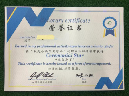 活動結(jié)束之后,“小高爾夫球手”職業(yè)體驗高爾夫“禮儀之星”證書的頒發(fā),讓學(xué)員在活動中既得到職業(yè)體驗的提升,同時獲得“德育”培養(yǎng)的證明,讓學(xué)員們玩得開心,收獲滿滿!